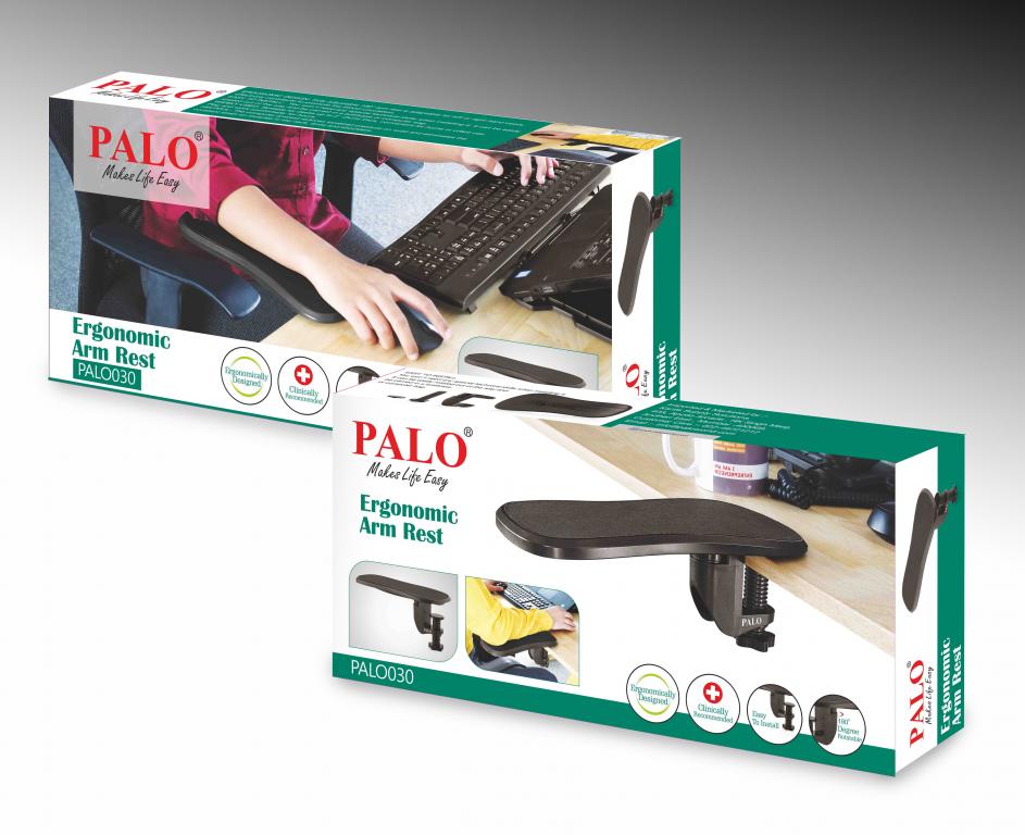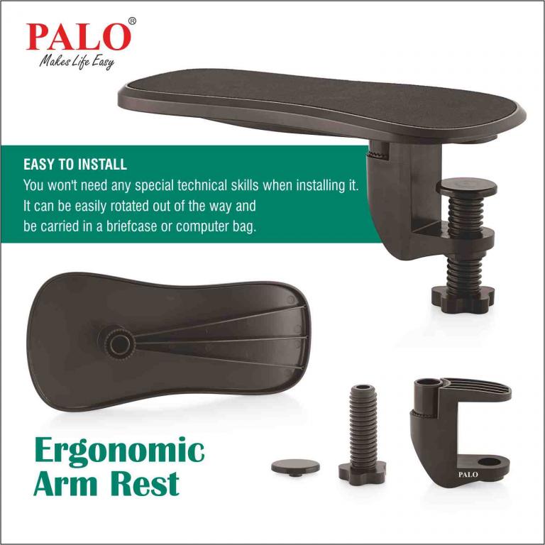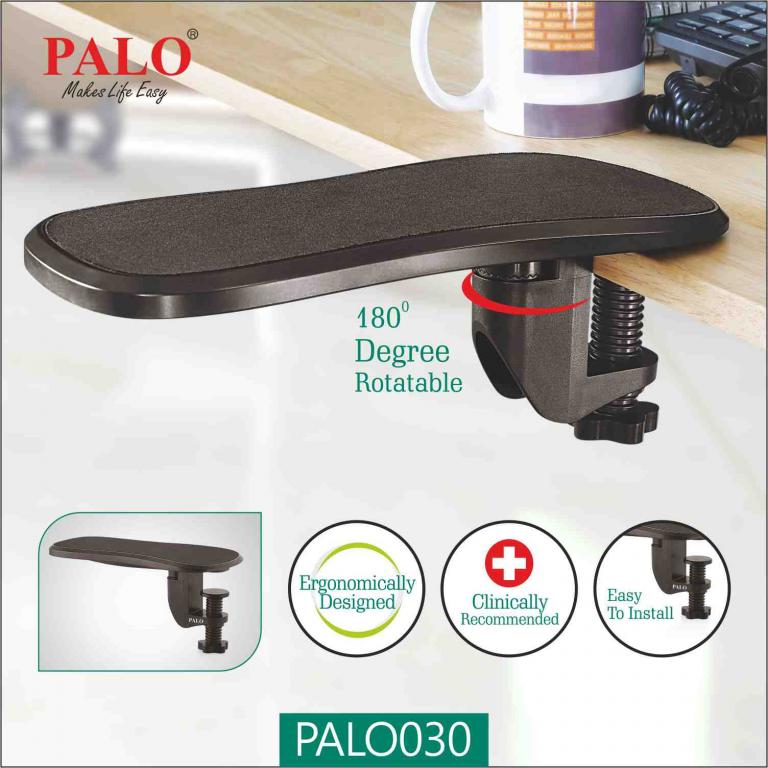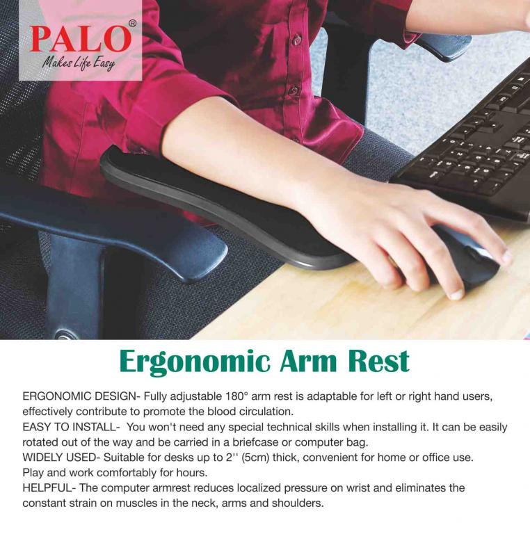 PALO030 ergonomic armrest is a 180 degree adjustable armrest adaptable for both right and left hand users. It reduces the localized pressure on the wrist and eliminates the constant strain on muscles in the neck , arms and shoulders. It is suitable for desks upto 2" (5cm) thick.It can easily be rotated out of the way and be carries in a briefcase or computer bag too. It is easy to install and requires no special skills for assembling it.