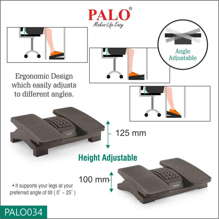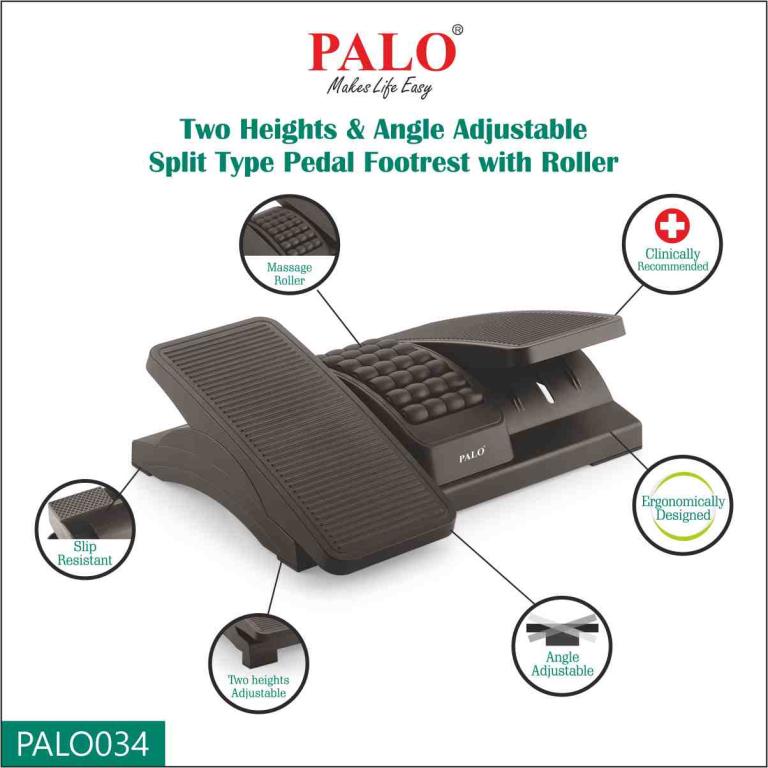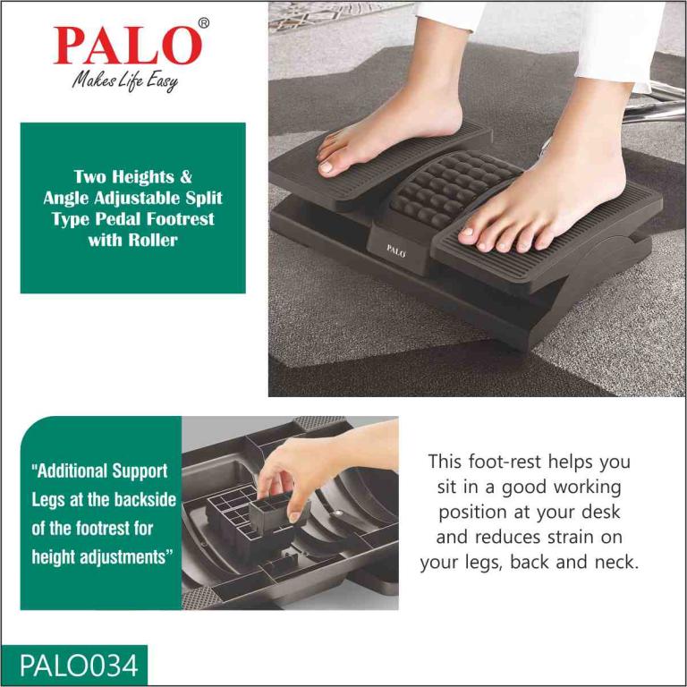 PALO034 two heights and angle adjustable footrest with roller helps massage tired feet, improve blood circulation and posture by keeping feet and legs elevated. It has 2 height adjustments. (100cm-12cm). The heights can be adjusted using easy to add additonal support legs at the backside of the footrest. It is comfortable and best for feet relaxation while prolonged sitting and durable in long term usage.